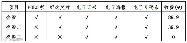 1.套餐一 89.9元:POLO衫+纪念奖牌+电子证书+电子海报+电子号码布。
