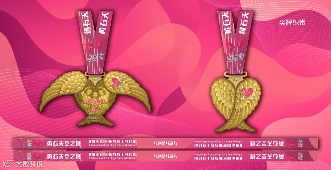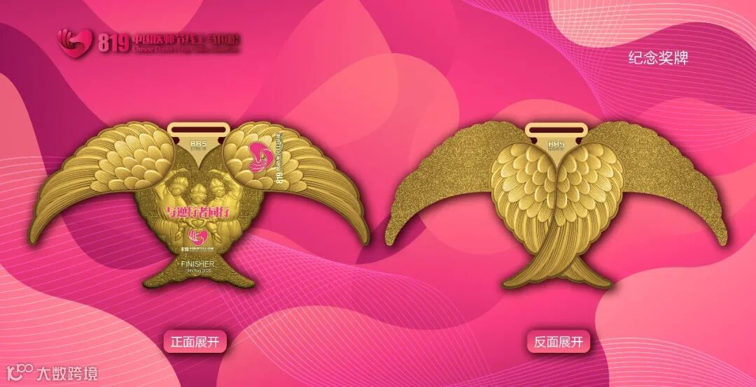 本次赛事的奖牌,由知名设计师李淳(其作品被世界六大马拉松组委会收藏)设计。奖牌设计非常精巧,翅膀可以活动,一张一合就像天使在起舞,非常具有趣味性。奖牌分为金色款、银色款和古铜款三种颜色,供大家选择,设计非常贴心。