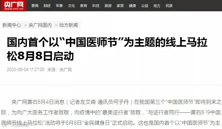 作为国内首个以“中国医师节”为主题的线上马拉松,其独特的赛事背景和浓厚的节日氛围,也让数十家主流媒体争相报道。