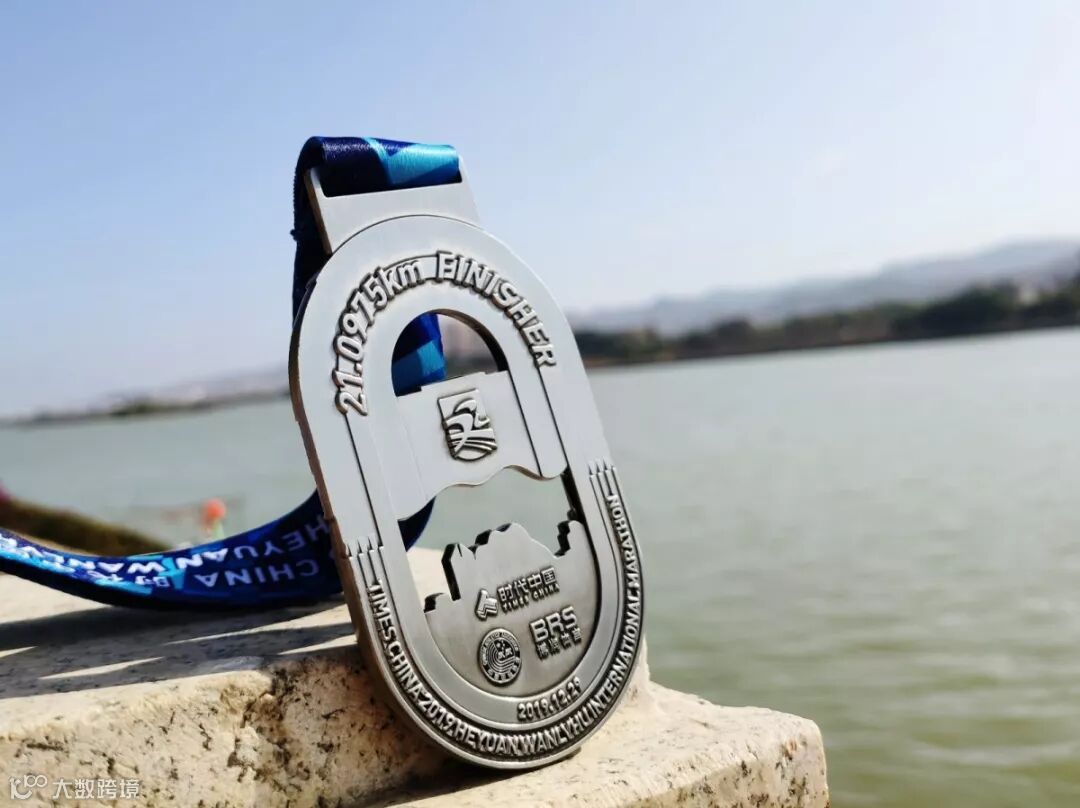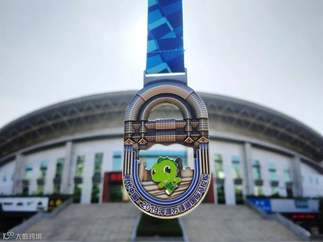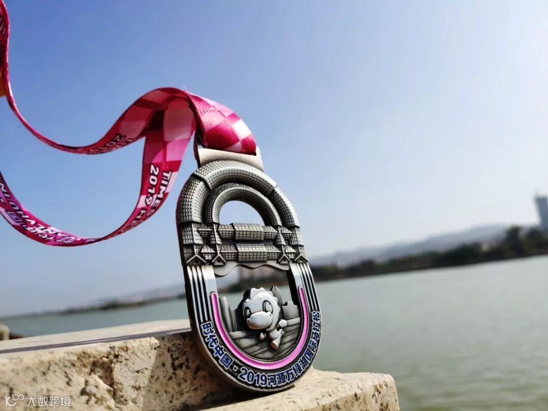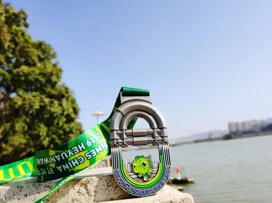 河源为"中华恐龙之乡",中间加入恐龙元素, 表达了河源是中国乃至全球馆藏恐龙化石数量最多的地方,龙龙为2019"河马"吉祥物,将奖牌与吉祥物结合赋予每一位完赛跑友更为独特的意义。
