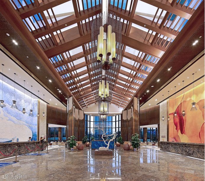 大堂的装饰秉承传统中西结合的装饰理念,风格汇聚东江、广府及潮汕文化的精髓,走进大堂大面积的装饰壁画、传统屋顶结构的吊顶装饰、灯笼装饰的吊灯、灰色花纹的