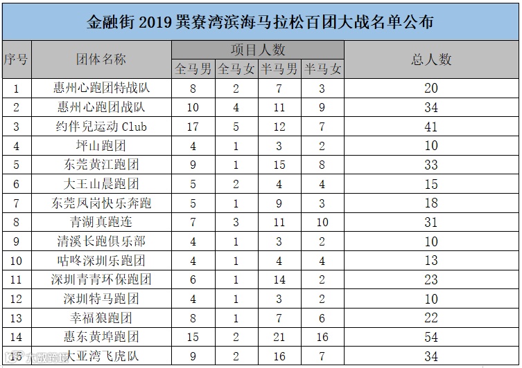 截止至9月30日,金融街巽寮湾滨海马拉松组委会收到来自各地,共65支跑团的资料。经过严格的筛选,最终有30个跑团,共计960名跑友进入“巽马”赛中赛——百团大战当中。