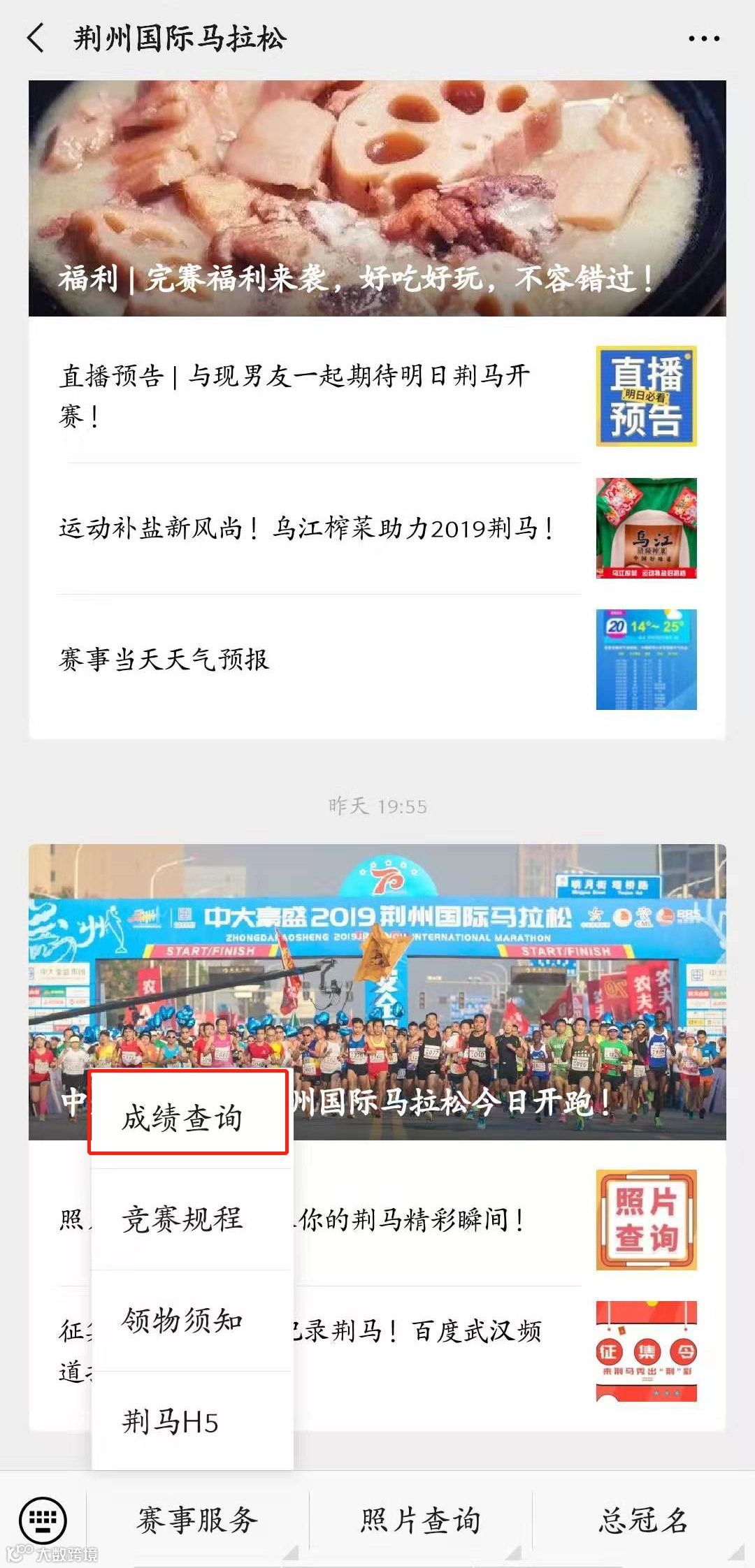 进入荆马微信公众号,点击完赛服务—成绩查询。