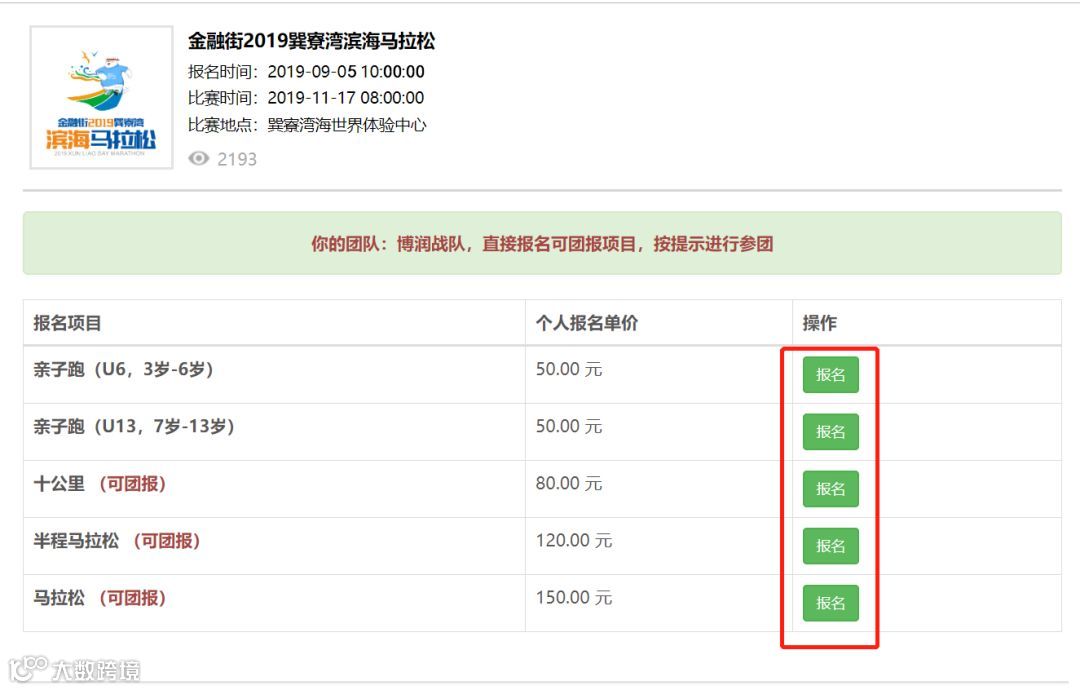 步骤一:进入对应赛事报名页面,选择需要团报的项目,如马拉松项目,点击报名