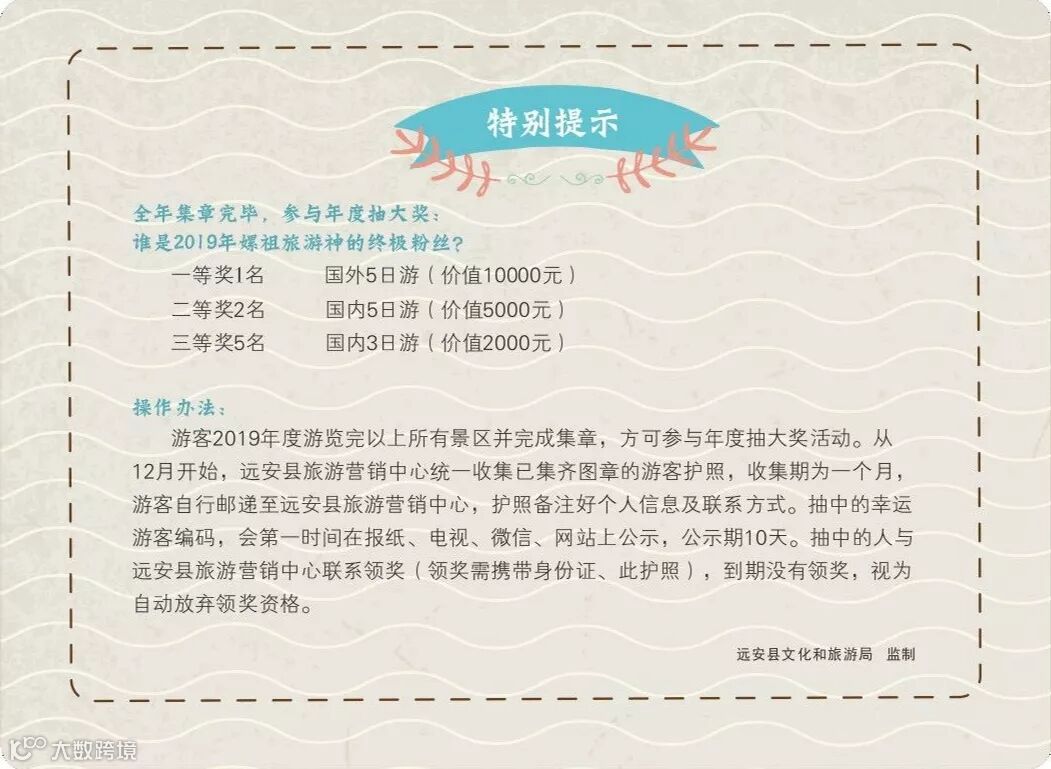 游览完景区并集章完毕,参与年度抽奖还有机会得到价值10000元的国外5日游,这种先免再折还能中奖的机会,简直不要太美好。