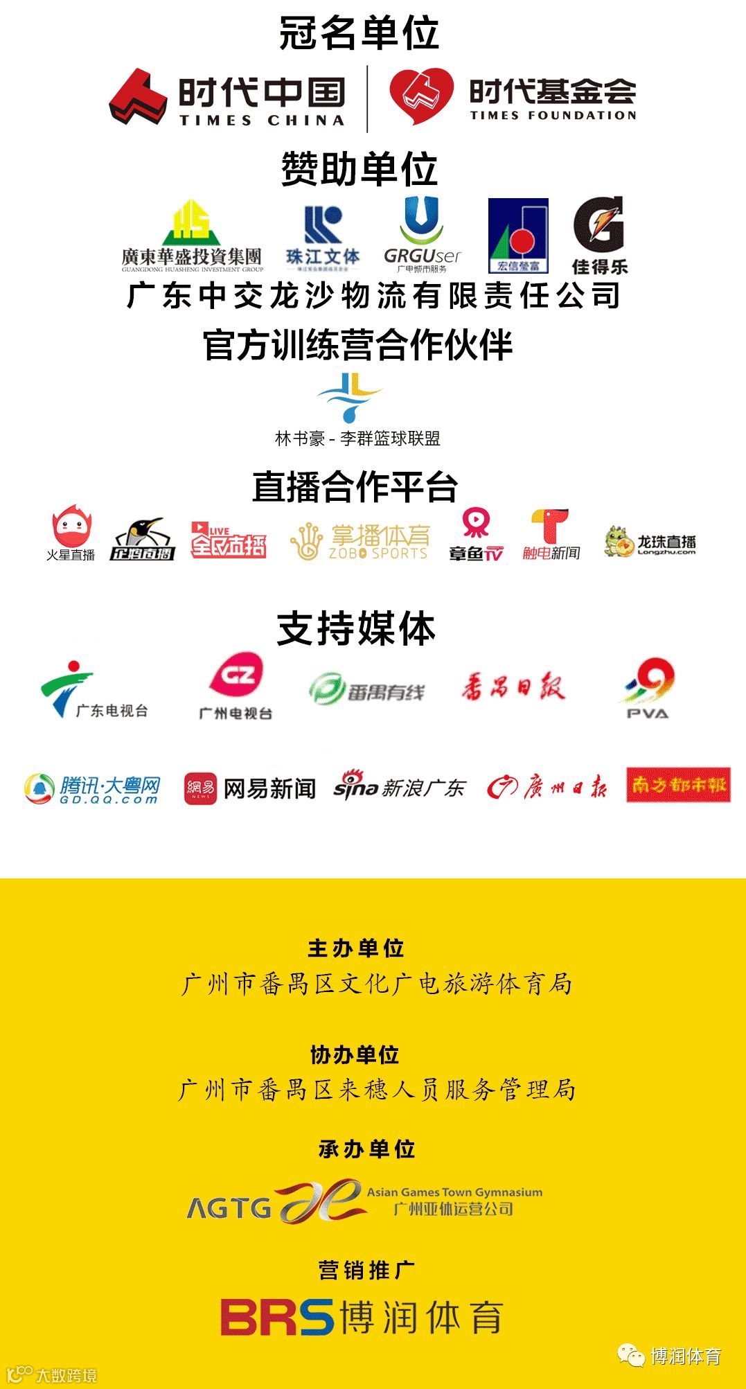 本次赛事由番禺区文化广电旅游体育局主办,广州珠江体育文化发展股份有限公司、广州广电城市服务集团股份有限公司、广州亚运城综合体育馆运营管理有限公司承办,番禺区篮球协会、林书豪—李群篮球联盟协办,广州博润体育科技有限公司独家营销推广,广东省时代公益基金会总冠名,广东华盛投资集团、宏信莹富、广东中交龙沙物流有限责任公司和百事可乐公司旗下全球领先的运动型饮料佳得乐赞助。