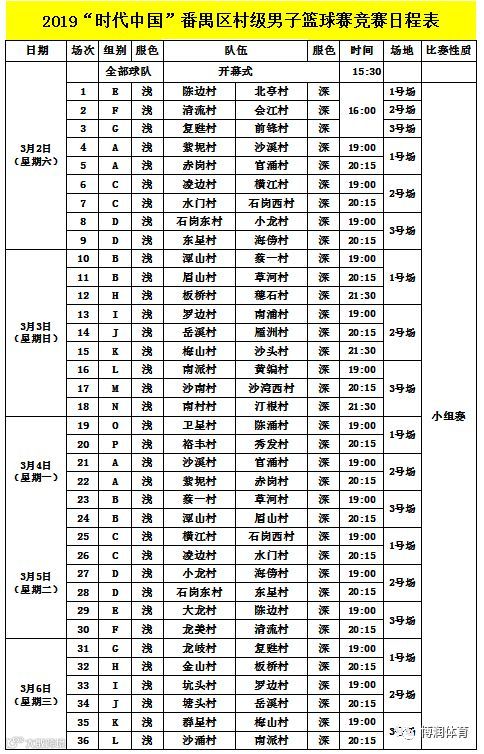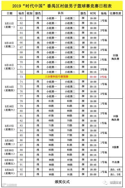 正是番禺区村级男子篮球赛,三十多年来在番禺深入发展和群众广泛参与,使得赛事年年异常火爆,比赛场面异常激烈,对抗程度堪比职业比赛。相信番禺区村级男子篮球赛,在“时代中国”冠名大力支持下,一定会愈办愈好。同时,向CBA职业队“时代中国广州”学习无兄弟不篮球,无论是输是赢,都有篮球和队友陪伴,一起奋斗一起拼搏一起奉献,永不言弃、团结拼搏的精神。下面让我们再次看看3月2日起至3月24日,未来93长比赛的赛程表,场场精彩,赶紧动动手指收藏起来哦:
