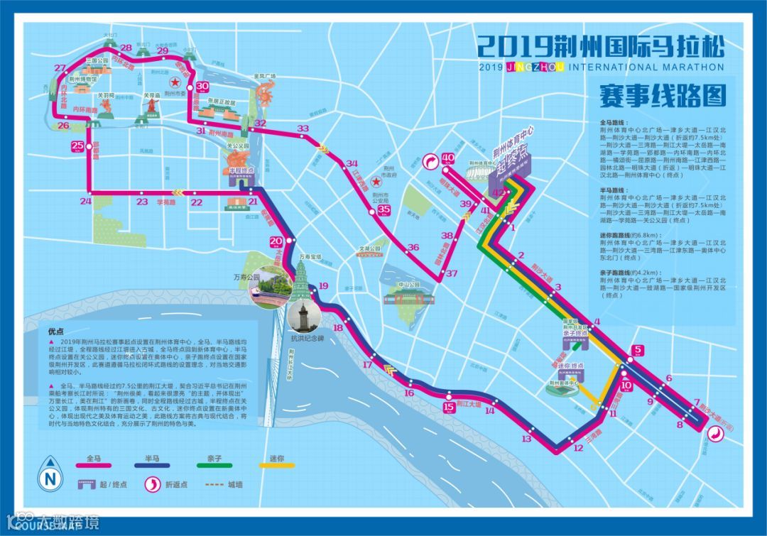 2019荆州国际马拉松延续去年路线设置,跨越“一江两城三区”,赛道风景优美,荣获「2018中国田协特色赛事"最美赛道"称号」。