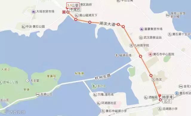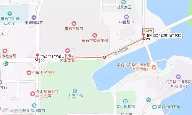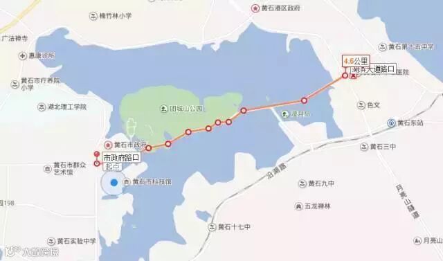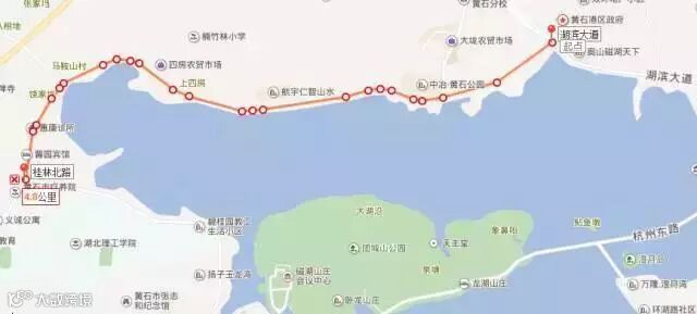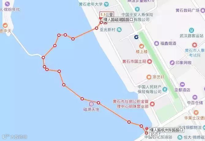 人民广场(起点)--杭州东路--澄月路--颐阳路--湖滨大道--磁湖路--桂林北路--杭州西路--大畈路(折返点)--杭州西路--人民广场(终点)