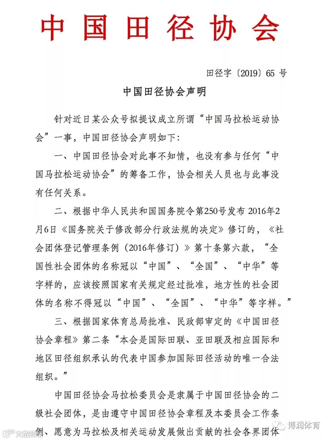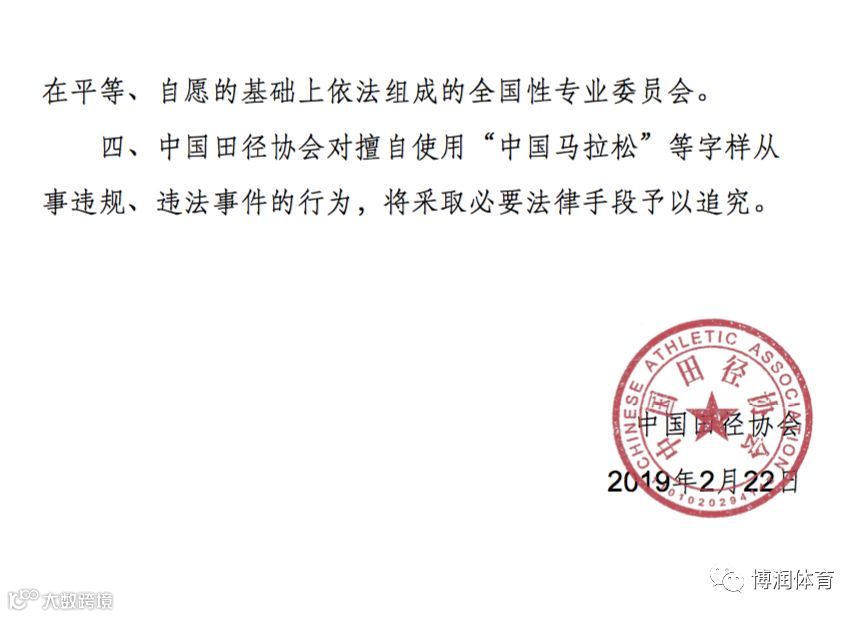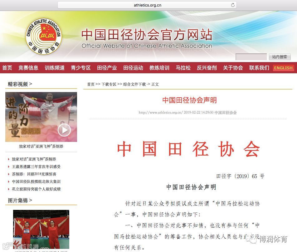 小编2月22日从中国田径协会官网获悉,针对近日某公众号拟提议成立所谓“中国马拉松运动协会”一事,中国田协声明称,对此事不知情,也没有参与任何,对擅自使用“中国马拉松”等字样从事违规、违法的行为,将采取必要法律手段予以追究。
