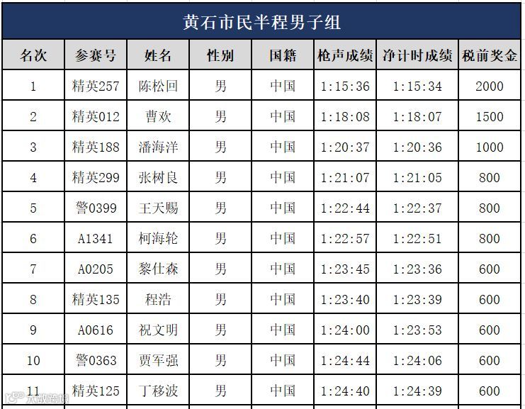 2018黄石磁湖国际半程马拉松于12月16日圆满结束。根据竞赛规程,为激发黄石市民的参赛积极性和自豪感,本次赛事特增设市民奖(含大冶市及阳新县),分别奖励男、女子半程马拉松前五十名选手,以净计时成绩决定奖励名次。奖金从300至2000元不等,重复获奖者奖金将不予累计,择高奖励。奖励对象为:
