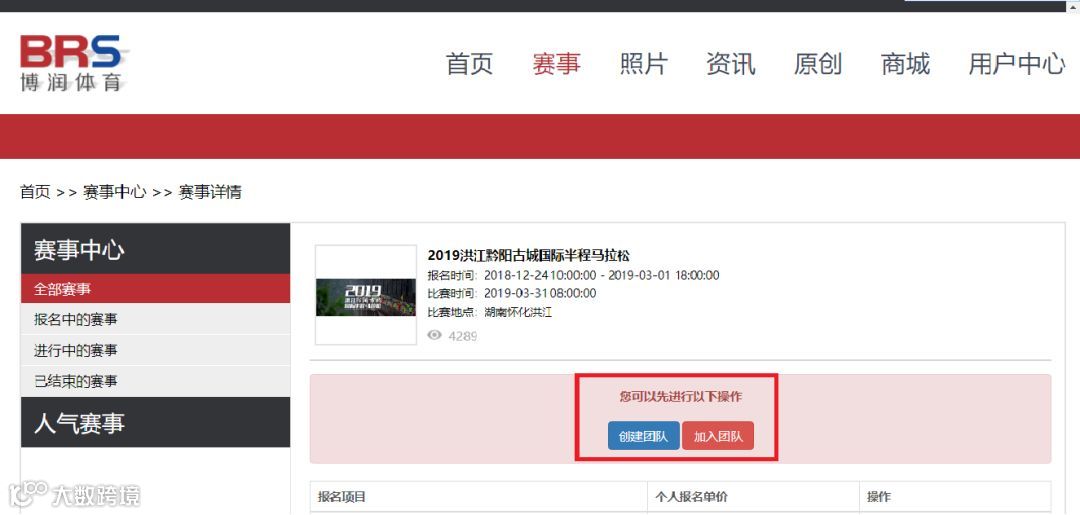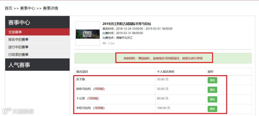 进入对应赛事报名页面,选择需要团报的项目,点击报名