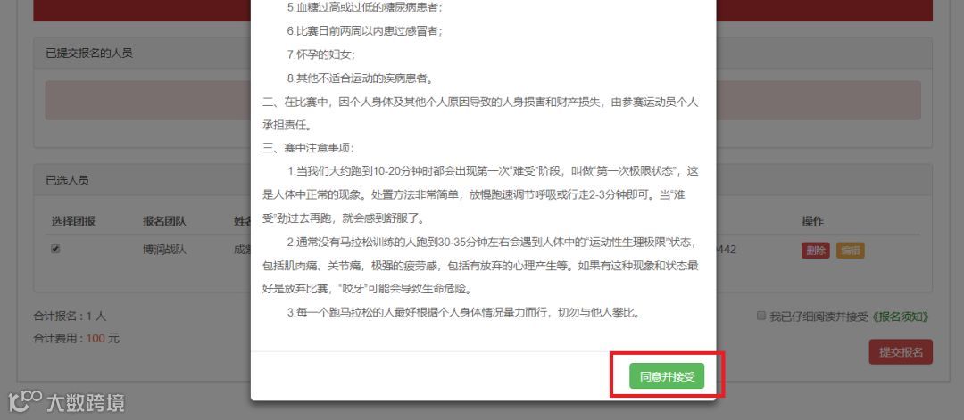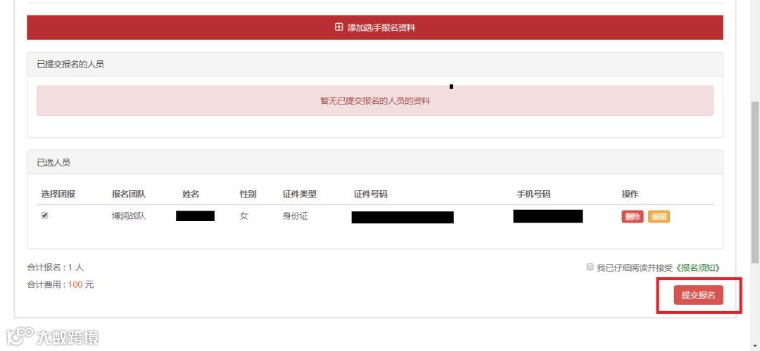 点击需要按钮,并点击我已仔细阅读并接受《报名须知》后,提交报名。(若点击不需要,该成员信息会显示在团队成员内,但该成员并未完成报名,请选手加入团队报名时务必选择需要按钮)填写团队基本资料后点击提交