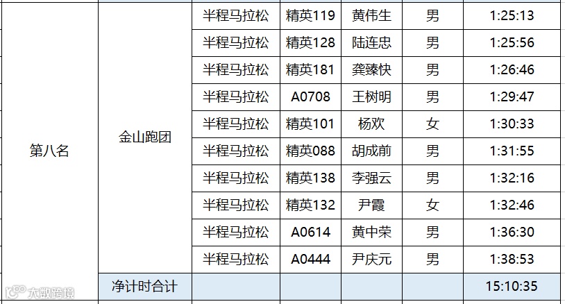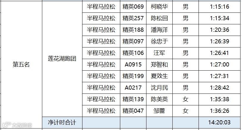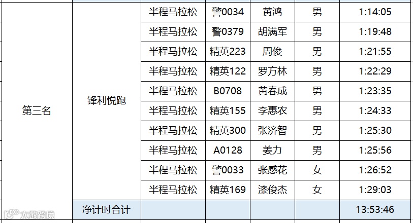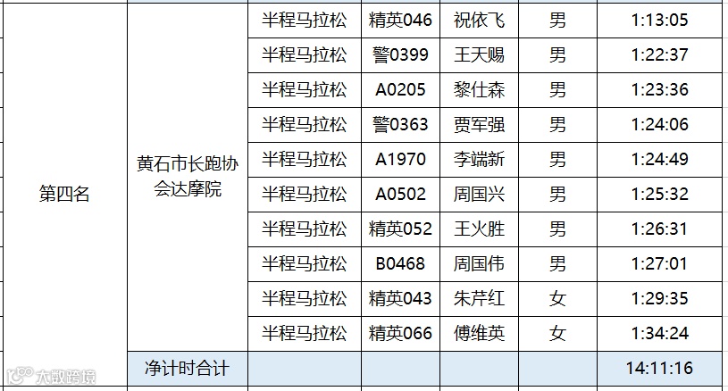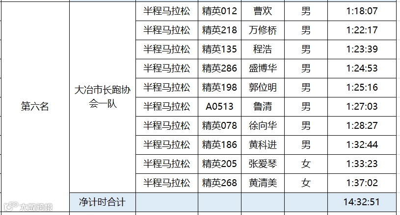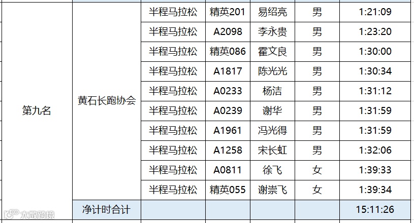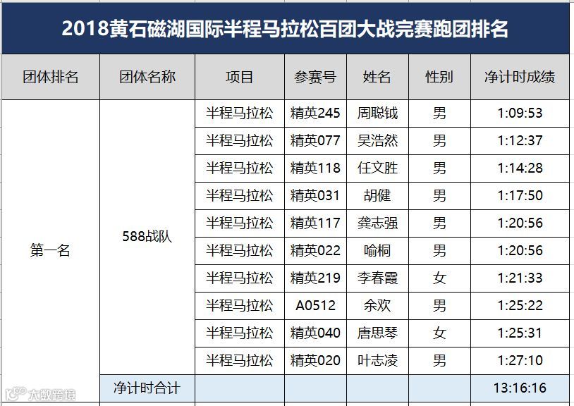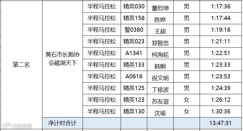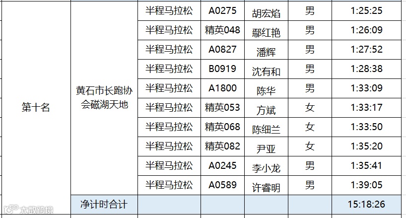 黄石磁湖国际半程马拉松于12月16日圆满结束。根据竞赛规程,为鼓励国内跑团的发展,黄石磁湖国际半程马拉松设立百团大战。具体规则如下:每个团队内至少有12名半程马拉松选手报名(其中至少有3名女性),组委会选取团队内半程马拉松完赛时间净计时最快的10名选手(其中至少2名女性)的成绩之和作为该团队成绩进行排名。“百团大战”只接受中国籍选手参加。