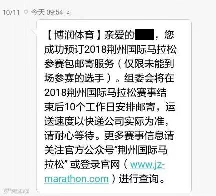 为了方便10月21日因个人原因未能到场参加中大豪盛2018荆州国际马拉松比赛的参赛选手,荆马组委会特别推出参赛包邮寄服务。