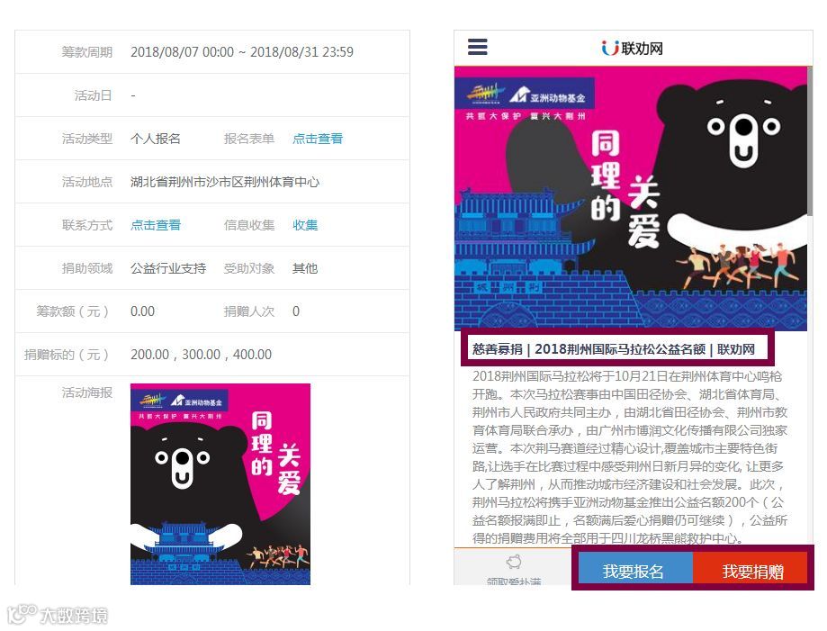 进入联劝网2018荆州国际马拉松公益名额页面进行报名