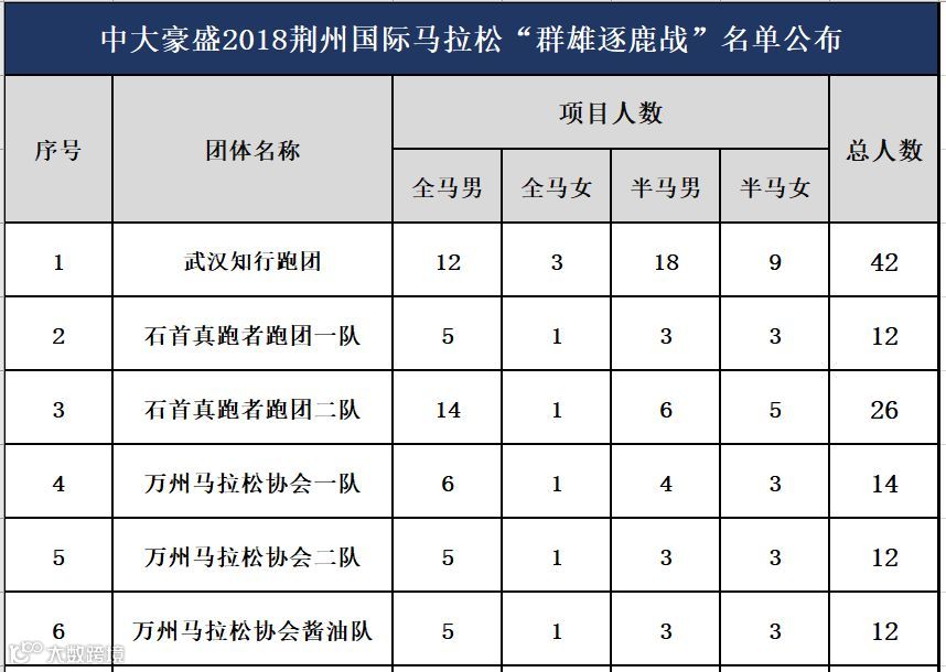 中大豪盛2018荆州国际马拉松群雄逐鹿战名单于2018年09月12日在官网以及官方微信平台公布公示三天,由于在公示期间内有跑团提出异议,经核实现更正为:群雄逐鹿战最终名单有64个跑团,共计3985名跑友进入“荆马”团队赛——群雄逐鹿战当中。
