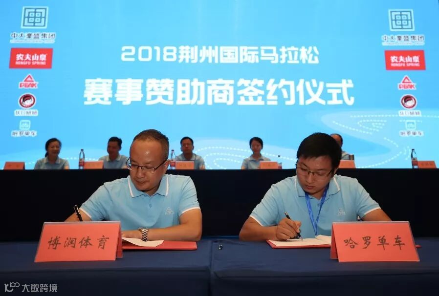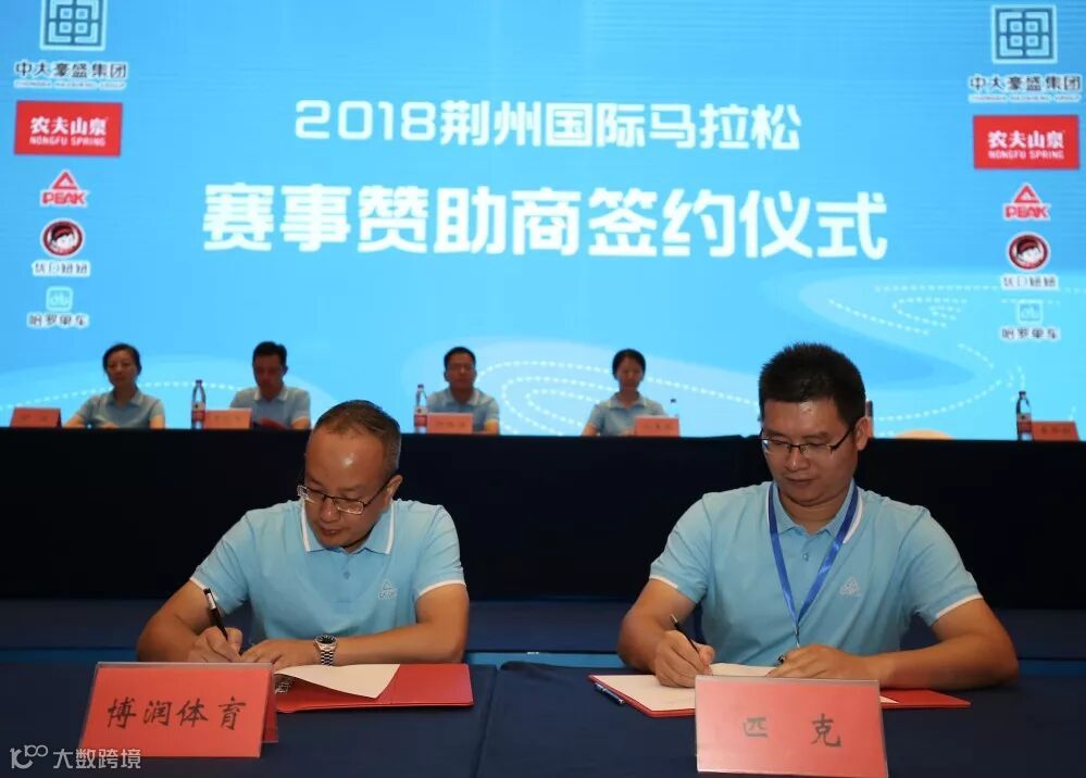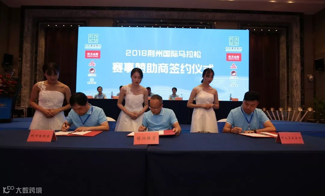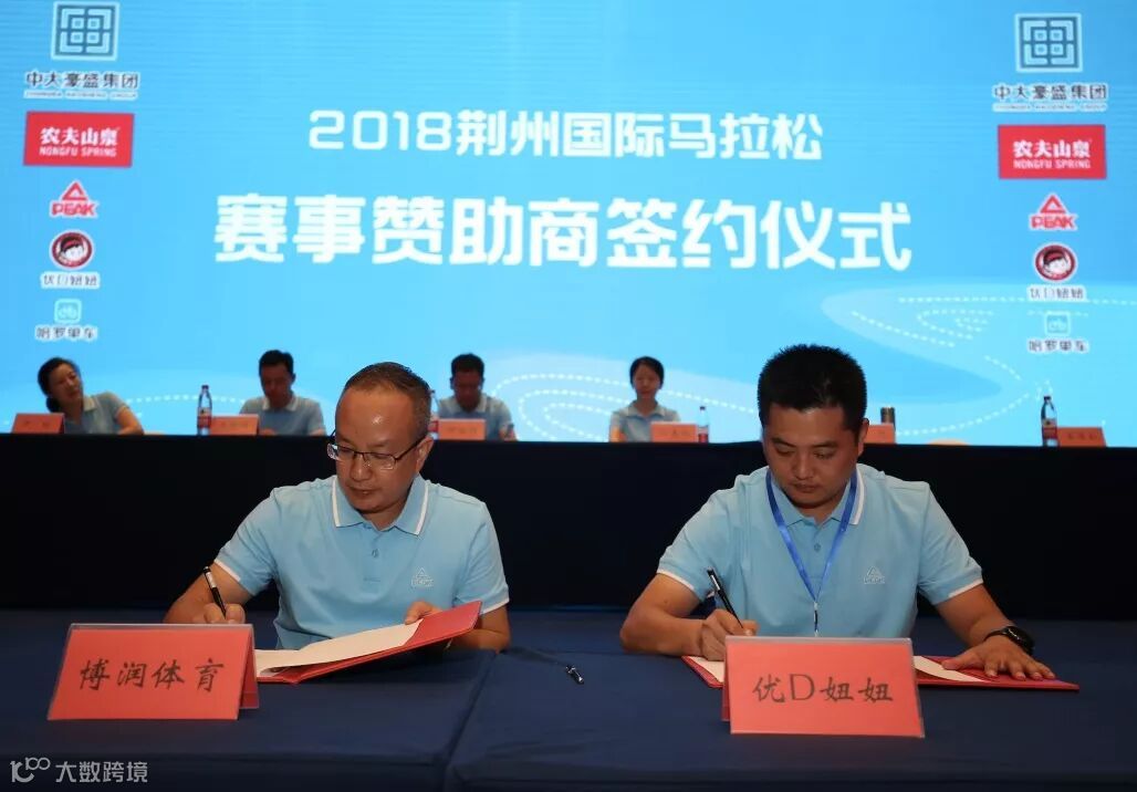其后,在发布会上举行了赞助商签约仪式,赛事独家运营商广州市博润文化传播有限公司总裁易伟新先生分别与2018荆州国际马拉松赛事总冠名荆州中大豪盛地产集团,博润体育全年战略合作伙伴农夫山泉股份有限公司(农夫山泉),赛事指定运动服装福建泉州匹克集团(匹克体育),独家烘焙品湖北优的贸易有限公司(优D妞妞),赛事唯一指定共享单车(哈罗单车)的代表们进行了现场签约。