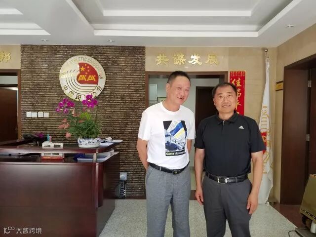 荆州国际马拉松组委会办公室负责人黄凯旋与国家体育总局田径运动管理中心田径中心主任、中国田径协会副主席兼秘书长于洪臣合影。