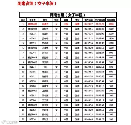 2018洪江黔阳古城国际半程马拉松于4月1日圆满结束。根据竞赛规程,2018洪江黔阳古城国际半程马拉松在2018年04月09日将2018洪江黔阳古城国际半程马拉松完赛湖南省组名单进行为期14天的公示。在公示期内,有1名参赛选手对此名单提出申诉,经核查,确认申诉情况属实。更正成绩后,排名也更正:湖南省组(女子半程)第一名为选手周清兰(精英B008),原第一名到第二十名往后顺延一名。经组委会研究决定,湖南省组(女子半程)项目奖励至第二十一名。