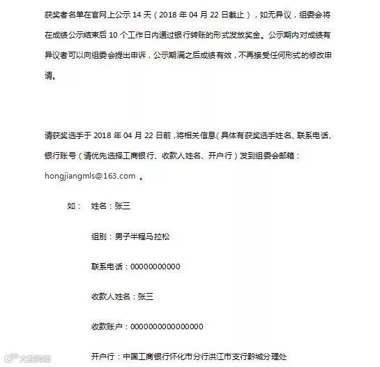 请获奖选手于2018年04月22日前,将相关信息(具体有获奖选手姓名、联系电话、银行账号(请优先选择工商银行、收款人姓名、开户行)发到组委会邮箱:hongjiangmls@163.com 。