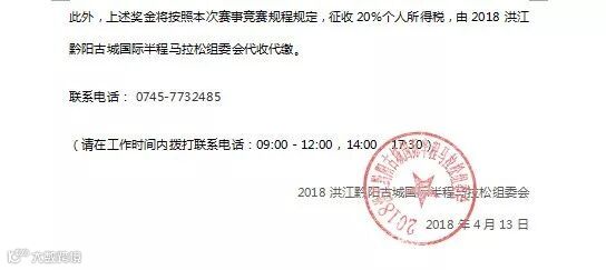 此外,上述奖金将按照本次赛事竞赛规程规定,征收20%个人所得税,由2018洪江黔阳古城国际半程马拉松组委会代收代缴。