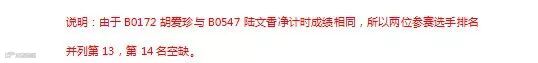 说明:由于B0172胡爱珍与B0547陆文香净计时成绩相同,所以两位参赛选手排名并列第13,第14名空缺。