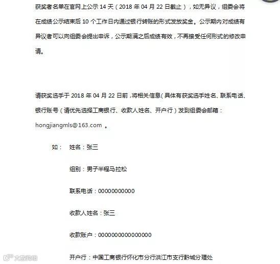 请获奖选手于2018年04月22日前,将相关信息(具体有获奖选手姓名、联系电话、银行账号(请优先选择工商银行、收款人姓名、开户行)发到组委会邮箱:hongjiangmls@163.com 。
