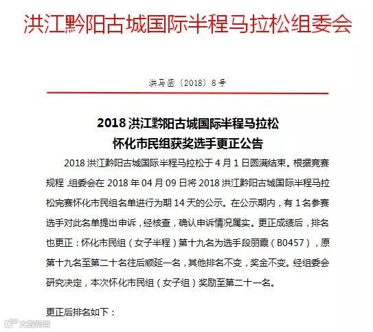 2018洪江黔阳古城国际半程马拉松于4月1日圆满结束。根据竞赛规程,组委会在2018年04月09日将2018洪江黔阳古城国际半程马拉松完赛怀化市民组名单进行为期14天的公示。在公示期内,有1名参赛选手对此名单提出申诉,经核查,确认申诉情况属实。更正成绩后,排名也更正:怀化市民组(女子半程)第十九名为选手段丽霞(B0457),原第十九名至第二十名往后顺延一名,其他排名不变,奖金不变。经组委会研究决定,本次怀化市民组(女子组)奖励至第二十一名。