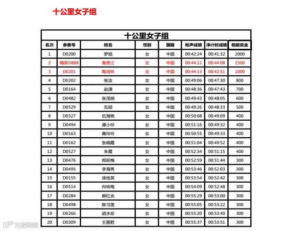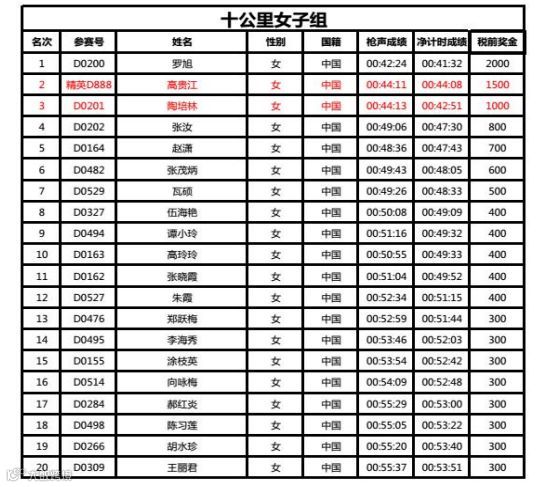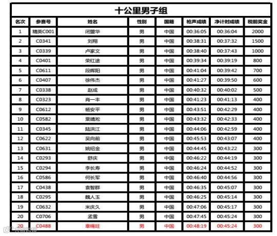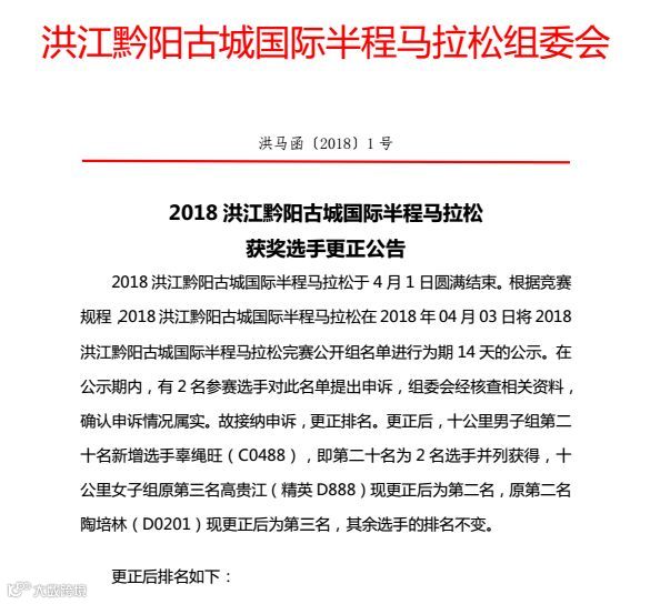 更正后,十公里男子组第二十名新增选手辜绳旺(C0488),即第二十名为2名选手并列获得,十公里女子组原第三名高贵江(精英D888)现更正后为第二名,原第二名陶培林(D0201)现更正后为第三名,其余选手的排名不变。