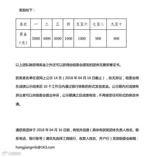 请获奖团体于2018年04月16日前,将相关信息(具体有获奖团体负责人姓名、联系电话、银行账号(请优先选择工商银行、收款人姓名、开户行)发到组委会邮箱:hongjiangmls@163.com