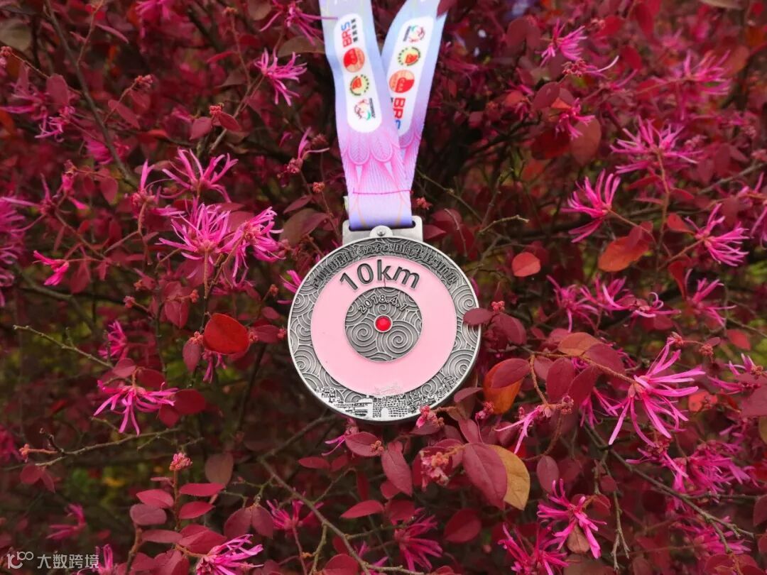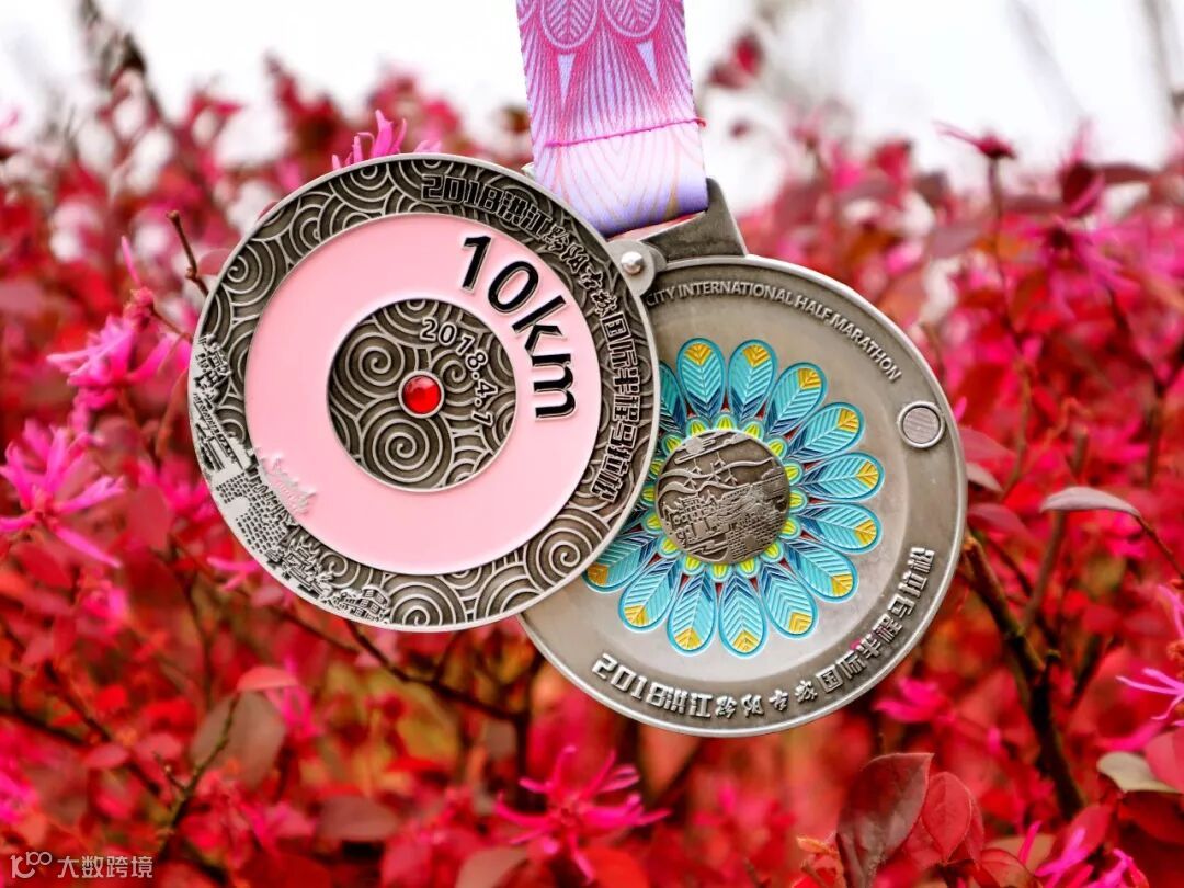 奖牌封面底纹采用祥云图腾,中圈采用桃花粉浮雕着公里数,内圈正中嵌的鲜艳红宝石,响应“一片冰心在玉壶”的千古名句,同时也充分体现本次的赛事主题。
