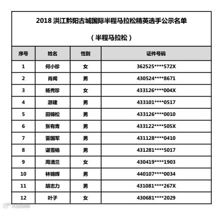 2018洪江黔阳古城国际半程马拉松精英选手公示名单 |