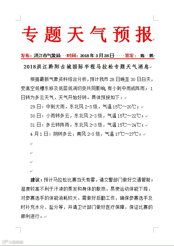 建议:预计马拉松比赛当天有雾,温度较高不利于汗液的蒸发和身体的散热,易使运动体能下降,对参赛选手的体能消耗较大,请各位参赛选手做好防护措施,运动后及时补充能量。