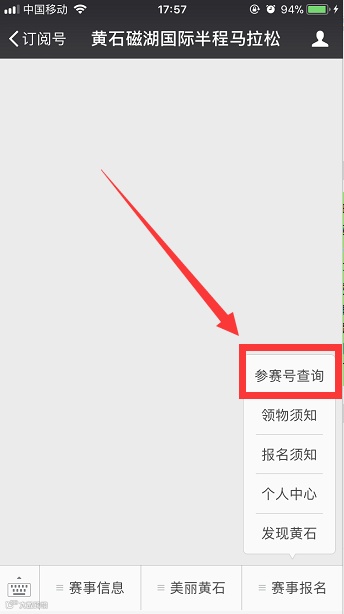 1、打开微信公众号“黄石磁湖国际半程马拉松”