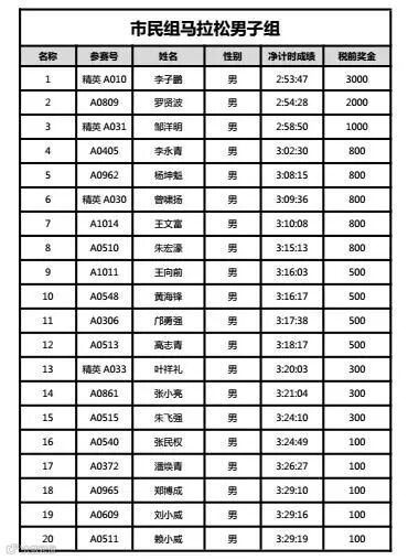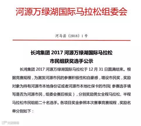 长鸿集团2017河源万绿湖国际马拉松于12月31日圆满结束。根据竞赛规程,为激发河源市民的参赛积极性和自豪感,增设市民奖,奖励对象为持有河源市本地身份证或者河源市本地社保卡的市民(参赛选手填写是否为河源市民,组委会赛后核实),分别奖励男女全程马拉松、半程马拉松市民组前二十名选手。