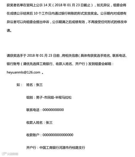 请获奖选手于2018年01月23日前,将相关信息(具体有获奖选手姓名、联系电话、银行账号(请优先选择工商银行、收款人姓名、开户行)发到组委会邮箱:heyuanmls@126.com 。
