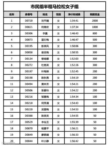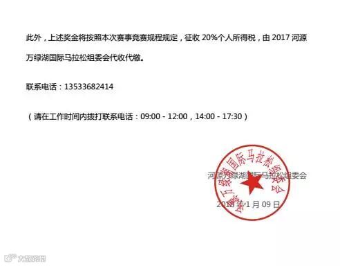 此外,上述奖金将按照本次赛事竞赛规程规定,征收20%个人所得税,由河源万绿湖国际马拉松组委会代收代缴。