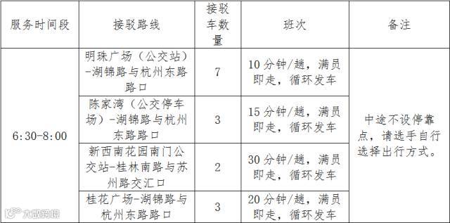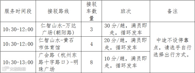 注:接驳车运行将受当天交通路况及天气等因素影响,如有延误,请耐心等待。车辆停泊位置都有明显标识及志愿者举牌,请各位参赛选手多加留意。实际运行状况以筹委会最终安排为准,如有不便之处,敬请原谅!