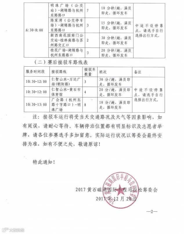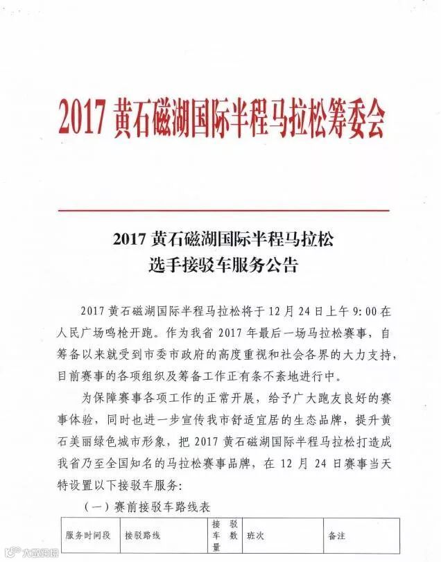为保障赛事各项工作的正常开展,给予广大跑友良好的赛事体验,同时也进一步宣传我市舒适宜居的生态品牌,提升黄石美丽绿色城市形象,把2017黄石磁湖国际半程马拉松打造成我省乃至全国知名的马拉松赛事品牌,在12月24日赛事当天特设置以下接驳车服务: