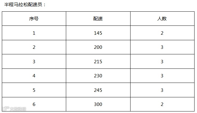 招募半程马拉松官方配速员16人,具体配速分配如下: