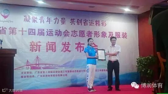 6月28日下午,广东省第十四届运动会志愿者形象及服装在湛江正式亮相,湛江籍奥运跳水冠军劳丽诗获志愿者形象大使聘书。