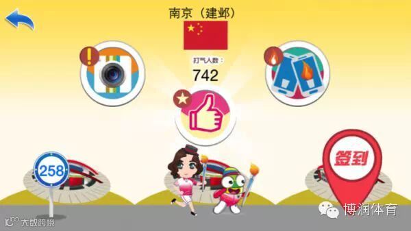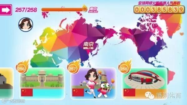 青奥会网络火炬传递共设258个站点,每一个站点都具该国家或地区的特色文化。用户可于每个站点打卡,亦可为此国家或地区的青奥运动员加油打气,更可与吉祥物砳砳一起合照。当然还要把以上经历分享到社交平台,向一众好友晒晒作为火炬手的喜悦和骄傲。