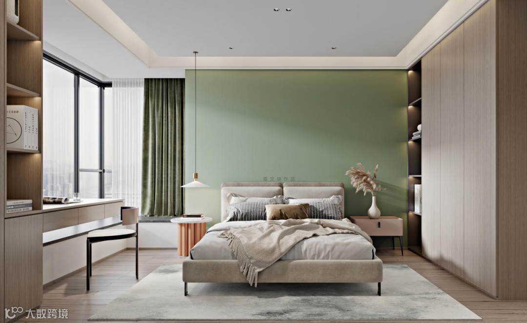 设计师选用浅绿色作为空间的主色调,木布艺色点缀轻奢优雅,无主灯的设计使得空间简约不失设计感。大型飘窗使室内的采光充足,视线也明显的清晰。