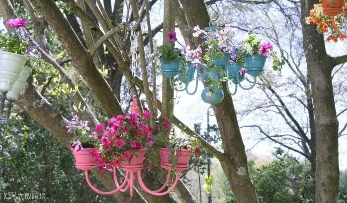 把不要的吊灯变成花盆来用很美,可以放置在阳台。