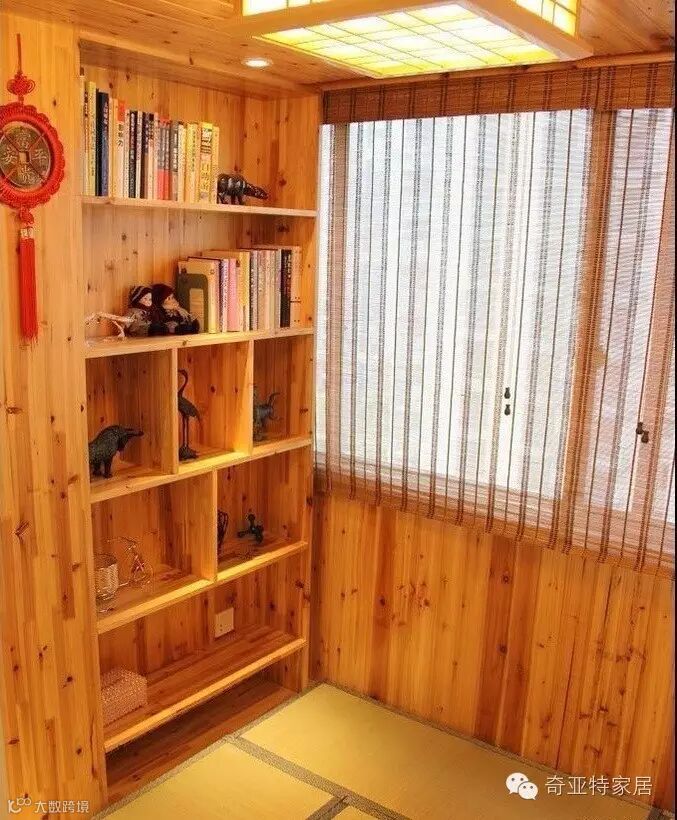书房式阳台:带点日式风格,天然木纹柜体和墙面的打造,让整个阳台质朴感浓浓。