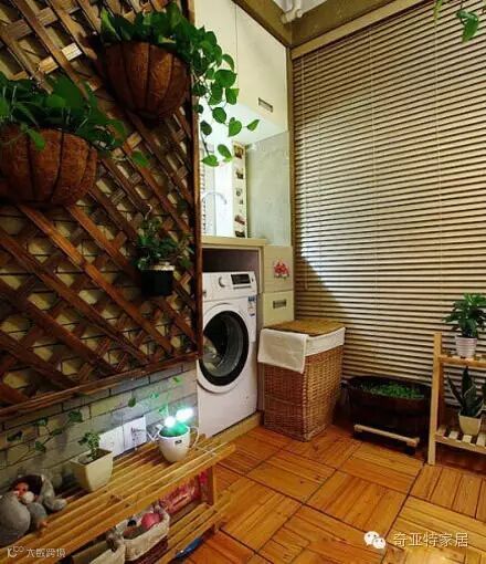 以木质与砖墙结合,这个阳台空间中还专门为滚筒洗衣机留了一个位置,便于平日里在这边清洗衣物,小巧简单,空间中加以绿植的点缀,这样的一间阳台空间应该算是比较大众化的,却很实用。