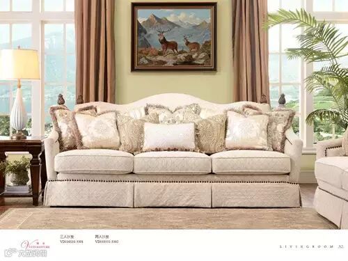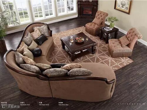 转角沙发已经只能用俯视的角度诠释它的韵味了,布艺带来不同的家居感受,茶几少量的破坏处理巧妙的增添了岁月的痕迹,彰显了庄园气势。