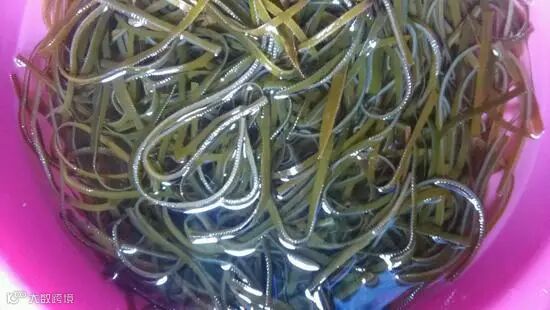 2.放入沸水锅里加1小勺醋煮2分钟后捞出,用冷水冲洗海带并将海带切成丝;