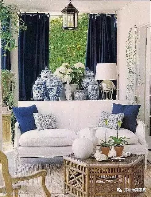 这个客厅虽然是完全西方形式的交流空间,但其中的瓷器、青花纹样靠垫,中式家具都有一种传统中国韵味